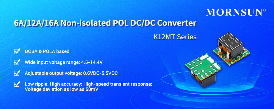 MORNSUN released a compact non-isolated POL DC/DC converter K12MT series. The K12MT series provides an output current of 6A, 12A, 16A, and their output voltage can be accurately adjustable from 0.6V to 5.5V.